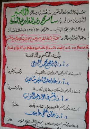 The Faculty council has approved the submitted request of the Researcher\ Samar Abd El Zaher Shabban about discussing her master thesis on Wednesday, 7\2\2016. The Discussion committee includes the following; Prof.Dr. Mossad Gamal El Din Ahmed, Prof.Dr.Ashraf Abd El Hakim Bayoumy and Prof.Dr.Hesham Yusuf. With our best wishes and great success.